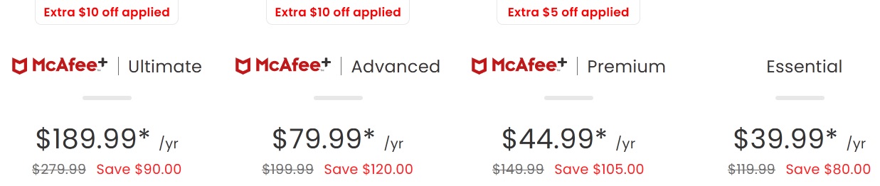 At the time of writing the best deal for McAfee was $69.99 for McAfee Total Security 2025, a sort of introductory price for the first year. The renewal price after the first year was $149.99. McAfee® Safe Connect VPN discounted price was $34.99. Here is McAfee deals page https://www.mcafee.com/en-us/consumer/mcafee-deals.html