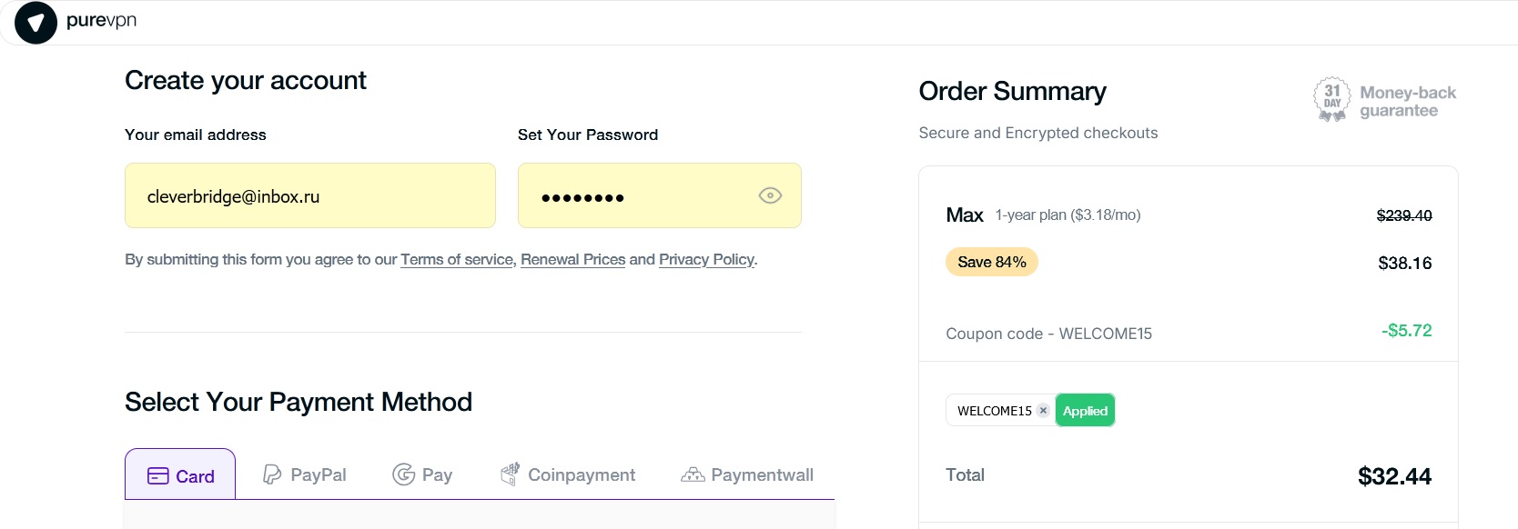 Entering a Coupon Code on PureVPN